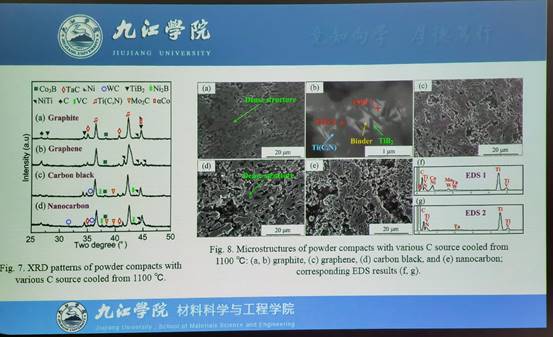首先,张梦贤教授以“C源对Ti(C,N)基金属陶瓷形成过程与组织性能的影响”为主题分享了近期研究工作内容。重点介绍了利用石墨烯、炭黑、纳米碳以及石墨等不同碳源对SPS烧结的Ti(C,N)基金属陶瓷形成机理研究。介绍了不同碳源添加后Ti(C,N)基金属陶瓷的结构、碳源的分布以及烧结过程中结构的变化对后期金属陶瓷的致密度、强度等性能的影响,重点讨论了不同碳源添加后芯环结构的形成,分享了研究金属陶瓷的潜在应用价值。最后张梦贤博士结合自己研究工作和其国基研究方向,与在座老师对该技术中发展方向及跨领域技术合作等问题进行了探讨与交流。