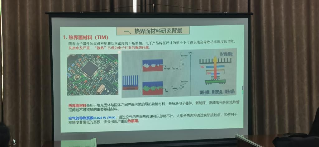 段兴凯博士以“热界面(TIM)材料研究进展”为题,介绍了热界面(TIM)材料的研究背景、研究现状和发展趋势,并结合热界面材料的应用场景分析了该类材料研究好和应用目前存在的问题,解释了热界面材料的传热机理和界面影响的主要因素,与在座老师对该材料在电子工程、散热领域的应用,以及后期拟开展的工作进行了探讨交流。
