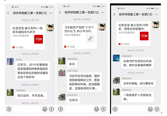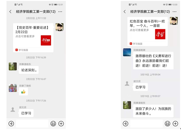 听完习近平总书记的讲话,经济学院教工一支部积极想办法,除了利用召开支部大会的机会统一学习之外,大家一致认为可以采用微信形式,每天学习一篇党史知识。