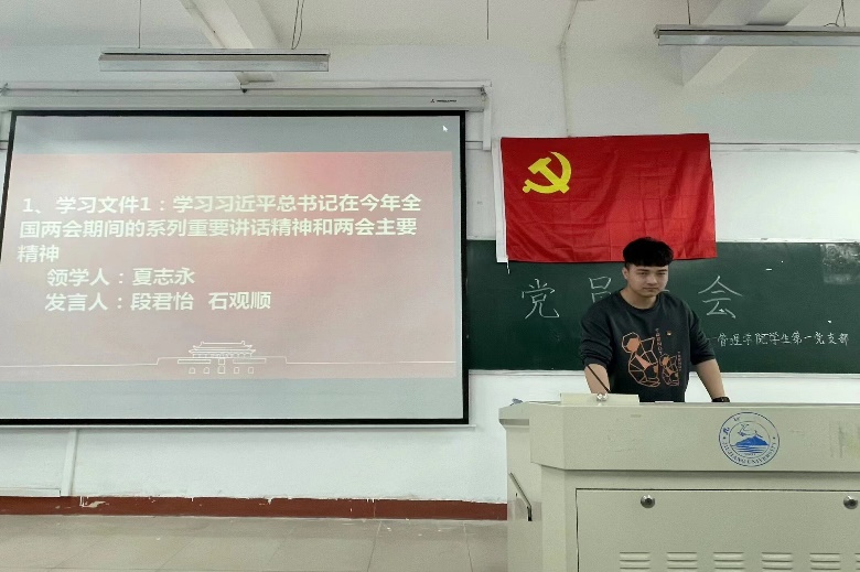 学生第一党支部段君怡在学习了习近平总书记在今年全国两会期间的系列重要讲话精神和全国两会精神后发表感悟:“新的历史节点,新的奋斗起点,从春天出发,向着美好未来奋进。我要认真学习贯彻习近平总书记重要讲话精神和全国两会精神,深刻领悟‘两个确立’的决定性意义,增强‘四个意识’,坚定‘四个自信’,做到‘两个维护’。在新时代的征程上,作为青年一代的我们要以更加昂扬的斗志、更加务实的作风、更加扎实的工作,为实现中华民族伟大复兴的中国梦而努力奋斗。”