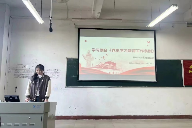 学生第四党支部邱卓琳在学习领会《党史学习教育工作条例》后谈到:“历史是最好的教科书,党史是最好的营养剂。作为预备党员,我们要把学习贯彻该条例作为重要政治任务,坚持把党史学习教育同自身实际结合起来,自觉从党的历史中汲取智慧和力量,切实把‘学史明理、学史增信、学史崇德、学史力行’的成果转化为学习的强大动力。”