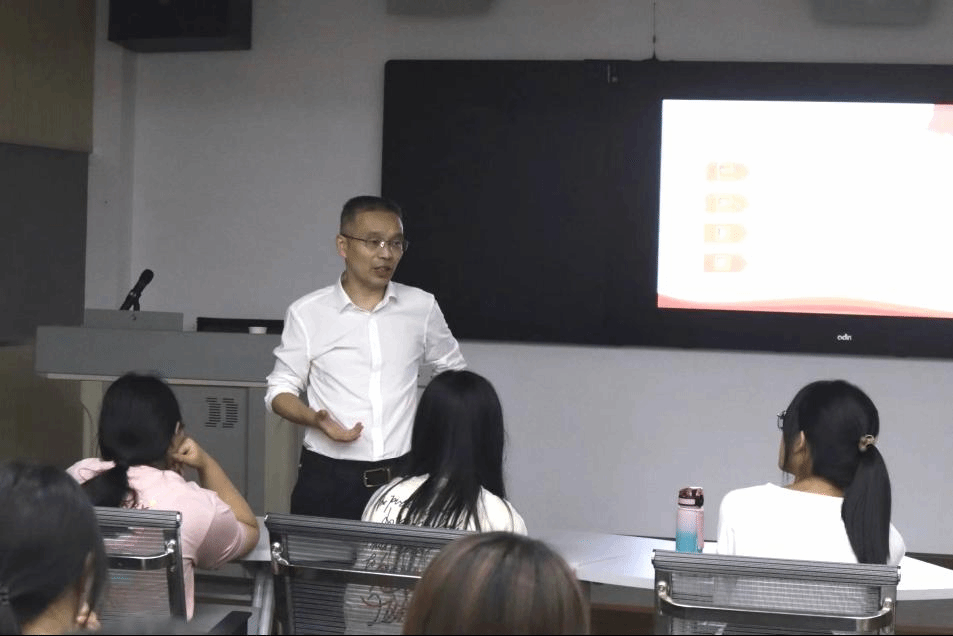 在立信楼523教室,赵宇剑以“让青春在强国建设民族复兴实践中综放绚丽之花——深入学习贯彻党的二十大精神”为主题,为市场营销专业A2351班同学上了一堂精彩生动的开学第一课。他对同学们加入管理学院大家庭表示欢迎,以“开天辟地、改天换地、翻天覆地、惊天动地”四个阶段带领同学回顾了百年辉煌党史。