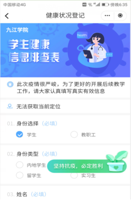 登录易校园平台,在首页上点击“健康登记”(如图6),进入图7所示的界面,如实填写信息。