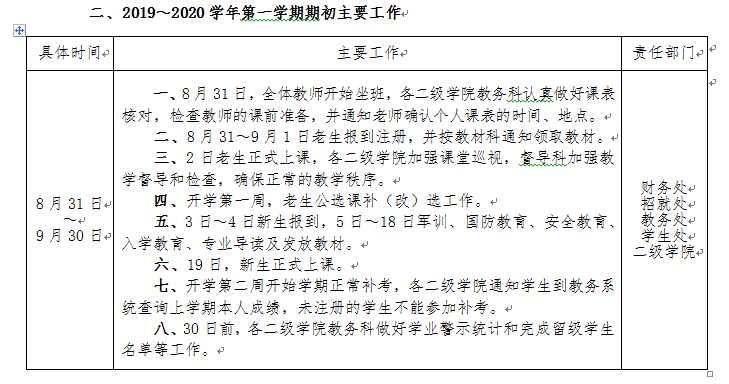 2018~2019学年第二学期教学工作即将结束,为了保证本学期各项教学工作顺利完成和下学期初教学工作正常运转,特制订《2018~2019学年第二学期期末和2019~2020学年第一学期期初教学工作安排》。经 6月20日校长办公会审定通过,现予以印发,请遵照执行。