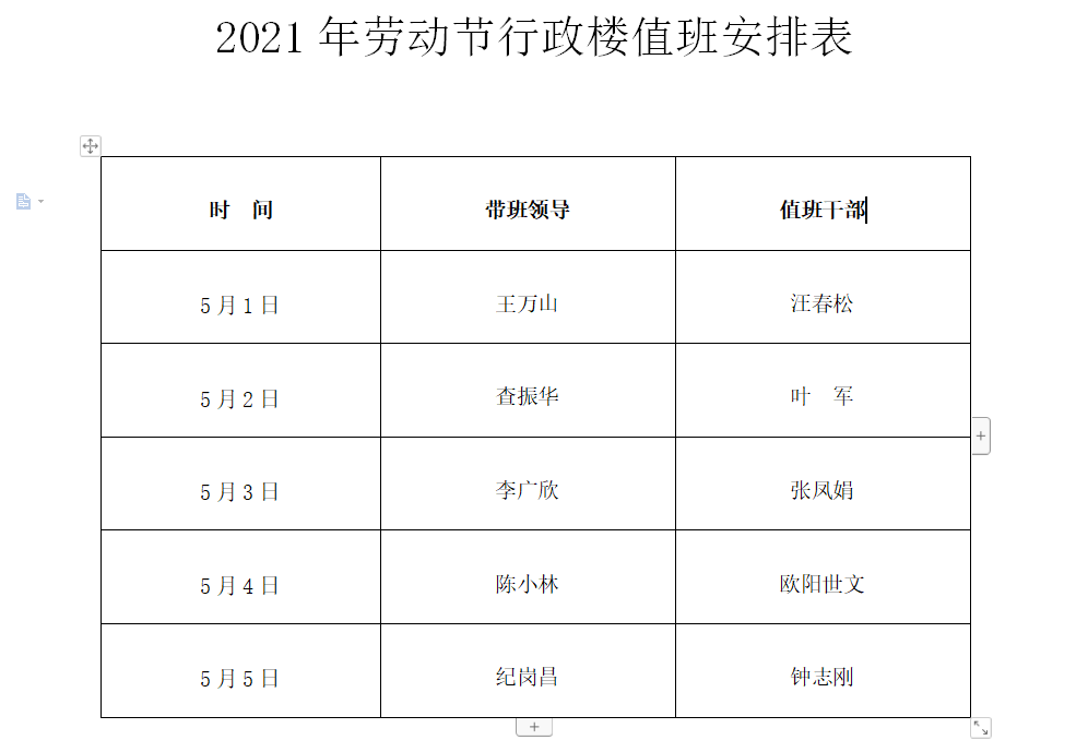 值班人员如因特殊情况不能到岗,请各部门自行调整并告知党政办。