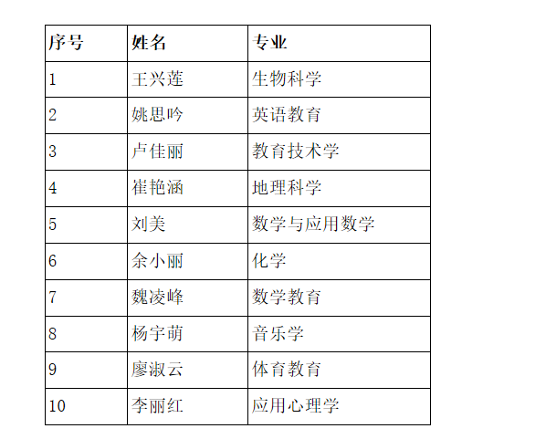 根据《 “‘万心蕙-王霈’十佳师范生”评选办法》,经本人申请,二级学院审核推荐,教务处组织评定,拟授予以下10名同学2020年度 “‘万心蕙-王霈’十佳师范生”荣誉称号: