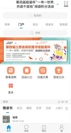 本活动使用超星“学习通”APP的“活动入口”模块,该模块集在线阅读与学习行为积分管理为一体,准确记录参赛者登录、阅读、知识测评等积分。