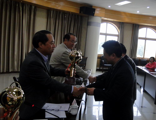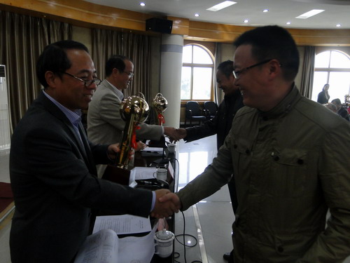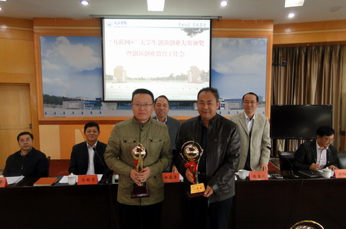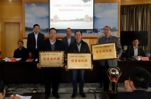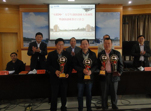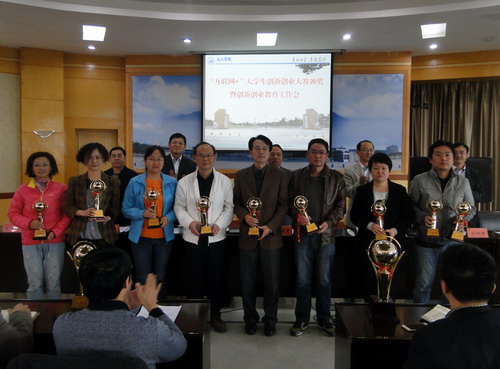 关于公布“互联网+”大学生创新创业大赛校园赛获奖名单的通知》。经个人申报,二级学院推荐,学校组织专家评审,评选出一等奖6个,二等奖10个,三等奖12个,优秀组织奖3个。甘校长、陶副校长和在主席台就座的领导小组办公室负责人向获奖二级学院代表颁发了奖杯和奖牌。