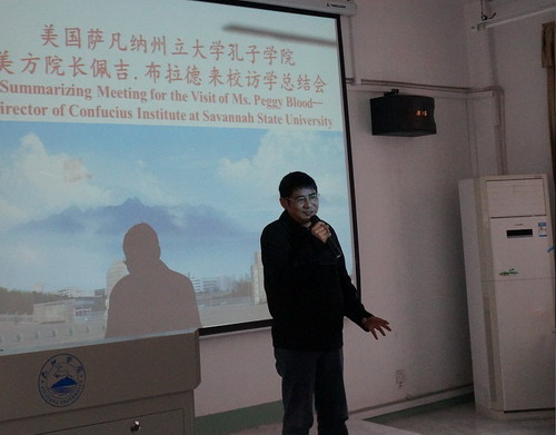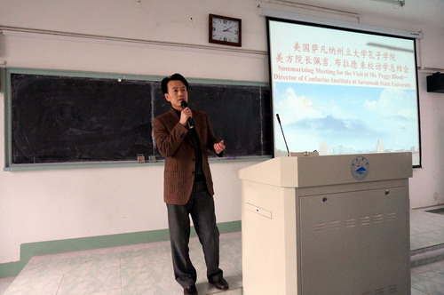 会上,杨副校长代表学校对佩吉.布拉德教授此次访学进行了总结。他指出,布拉德教授的系列精彩讲座不仅使我校学生感受了不同的文化,开阔了学生们的视野,有效地促进了学生专业的提高。布拉德教授本人也体验了中国的文化,了解了中国高等教育现状,双方进行了良好的交流,这将极大的增进两校之间的友谊,促进两校之间的合作,布拉德教授此行成效显著,两校将以此为契机,促进萨凡纳州立大学孔子学院的发展和更多的合作。