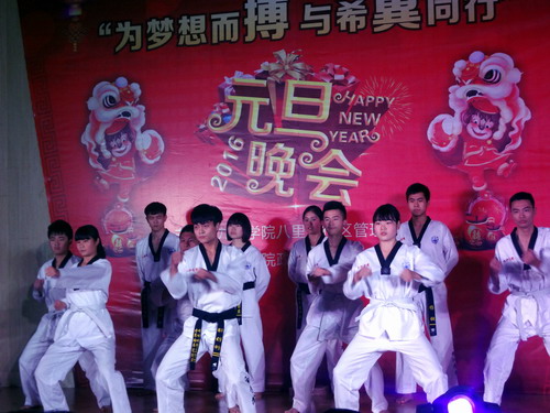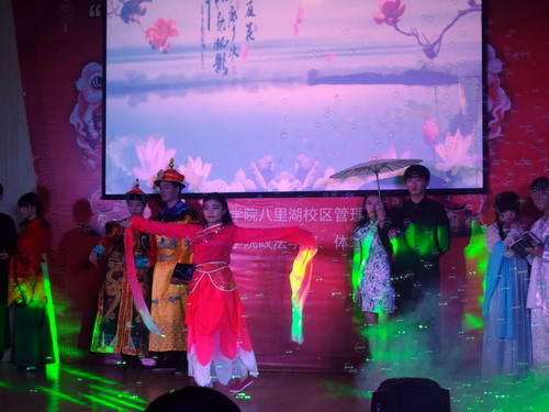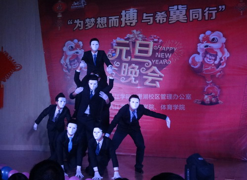 金龙腾跃、虎虎生风,晚会在精彩的舞龙舞狮及中华武术表演中拉开了序幕。八里湖校区管理办公室主任段宝斌致新年贺词。他代表八里湖校区管理办公室党政向辛勤耕耘、无私奉献的八里湖校区全体教职员工及莘莘学子表示新春的祝福!向关心与支持八里湖校区发展的各级领导及各部门、二级学院表示衷心的感谢!祝福大家新年快乐,阖家幸福!祝愿