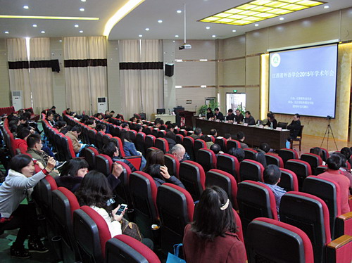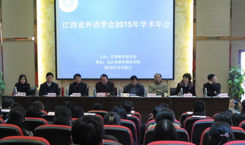 12月26日,由我校外国语学院承办的江西省外语学会2015年学术年会,在我校香远楼三楼学术报告厅隆重召开,出席大会并在主席台就座的有江西省政协文史委副主任、省外语学会名誉会长陈绵水教授,副校长陶春元教授,省外语学会名誉会长赵国杰教授,省外语学会会长况新华教授,副会长外国语学院韩琨院长等。来自江西省各高校的专家、学者共计160余人参加了会议,大会由学会副会长东华理工大学卢仁顺教授主持。