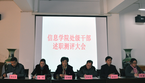 12月29日下午,吴桃娥副校长在组织人事部副处级组织员夏英、劳资科副科长朱俊松的陪同下,参加了信息学院处级干部述职测评大会,会议由夏英主持。