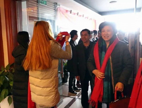 毕业生热情为学校领导、老师们佩戴红围巾,寓意着希望双方感情像火一样热烈,期待合作顺利,共同进步。