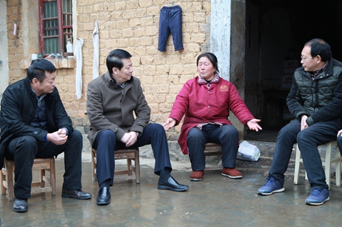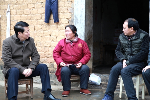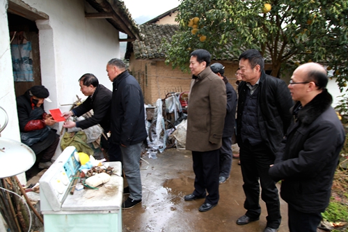 在中国传统佳节春节到来之际,为进一步深入贯彻中央扶贫开发工作会议和全省经济工作会议总结暨扶贫开发工作动员部署会议精神,把精准帮扶落到实处,帮助贫困村困难群众度过一个温暖幸福、快乐祥和的新春佳节,1月28日下午,校党委书记郑翔、副校长杨焱林带领党办、组织人事部、离退休职工管理处等部门负责人对学校定点帮扶贫困村——武宁县官莲乡东山村的贫困户、残疾人户、计划生育户和老党员、老村干部等进行走访慰问。