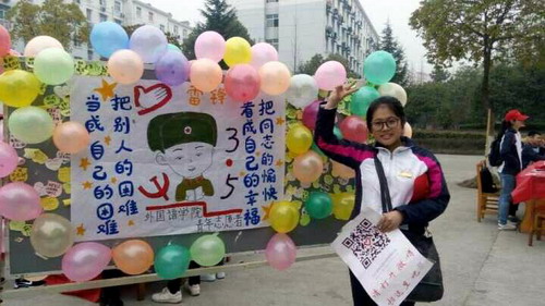 同时,乐翼服务队的志愿者们在火车站开展了学雷锋志愿活动。他们在火车站广场清理垃圾,在候车室免费提供茶水,为来往的旅客提供热情服务,让每一位旅客感受到九江火车站和志愿者带来的温暖。而化环学院的志愿者们经过2个小时的长途跋涉,到达了目的地——鄱阳湖之畔。志愿者们分组分区域去进行环保宣传活动。土建学院的志愿者们在“雷锋日”里开展了志愿者敬老院活动,给老人们送去一股春风,递去一份温暖。他们帮忙打扫卫生,他们细心搀扶老人,他们给老人们表演节目唱一首首温情的歌曲。