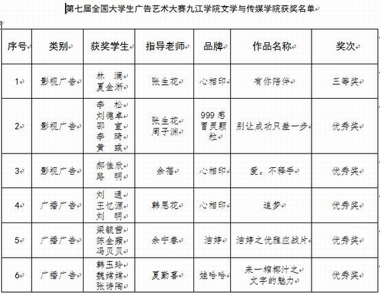近日,从第七届全国大学生广告艺术大赛及2015年江西省大学生科技创新与职业技能竞赛组委会陆续传来好消息,由张生花老师指导的、文学与传媒学院林澜、夏金淅同学制作的影视广告《有你陪伴》荣获全国三等奖,由张生花、周子渊老师指导的、文学与传媒学院李松等同学制作的影视广告《别让成功只差一步》等五件作品获得全国优秀奖。