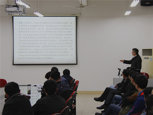 3月30日下午,应会计学院邀请,华东交通大学欧阳志刚教授做客立信楼,为会计学院全体教师做了题为《新常态下货币政策工具的组合效应与特质效应》的专场学术报告。副校长王万山到场与会计学院教师一起聆听了报告。报告由陈小林院长主持。