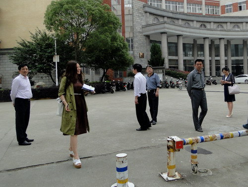 在学生宿舍通往教学楼的出口处,当看到有一个拦车杆的铁柱烂坏了,王副校长希望保卫部门及时修理。