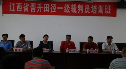 6月11日上午8:30,在八里湖校区综合楼621室召开了江西省晋升国家田径一级裁判员培训班开班仪式,仪式由江西省体育局田游中心付锋副主任主持,出席仪式的领导有国家体育总局训练局杨培刚副局长、江西省体育局青少处周凌云处长、江西省田游管理中心竞训科金丽琴科长、