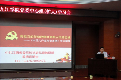 为推进“两学一做”学习教育的深入开展,学习贯彻《中国共产党问责条例》,9月23日下午,学校在逸夫图书馆学术报告厅召开9月份党委中心组(扩大)学习会,专题学习了《中国共产党问责条例》,中共江西省委党校党史党建教研部黄德锋博士应邀作了题为《用担当的行为诠释对党和人民的忠诚——