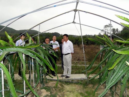 杨焱林一行参观了东山村村部,察看了官莲乡火龙果栽培基地,考察了官莲中学,并与县农工部、官莲乡党委和东山村支部负责人进行座谈。
