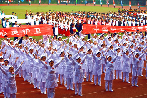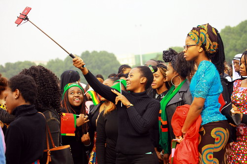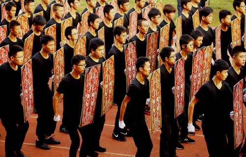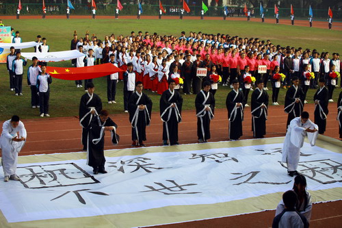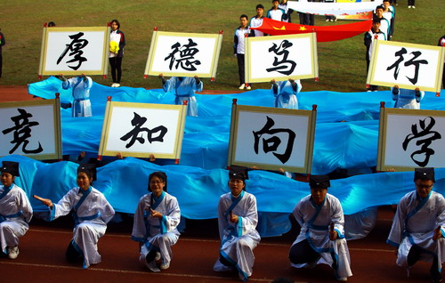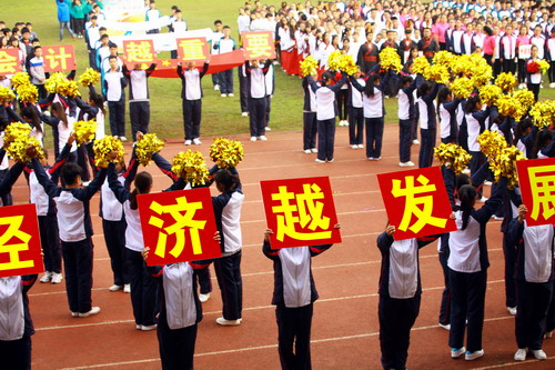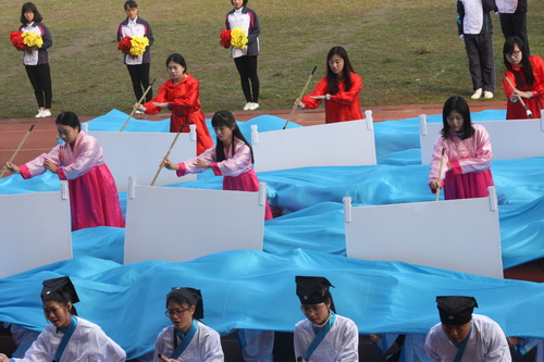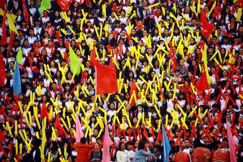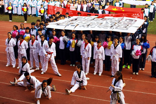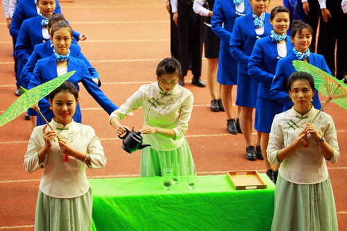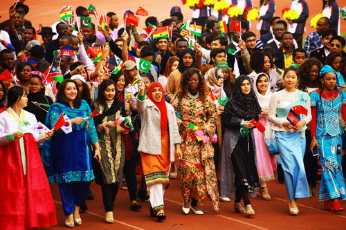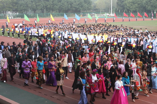 身着鲜丽民族服饰的留学生代表队压轴出场,给开幕式会场带来一股异域风情,他们在欢快音乐声中跳起非常具特色的舞蹈更让观众台响起热烈的掌声。