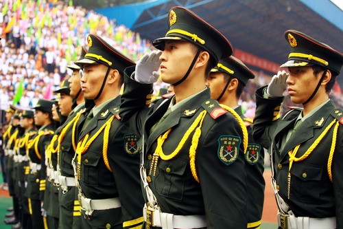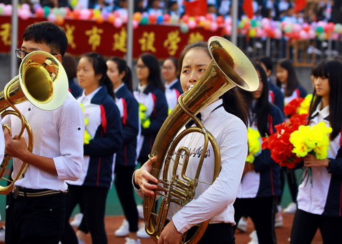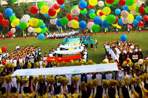 上午8点,在雄壮音乐的伴奏声中,开幕式的入场式仪正式开始。迎着明媚的阳光,仪仗队护卫着校旗、校徽首先入场,他们步伐一致、昂首挺胸,充分展现着我校学子的积极向上的精神风貌;鲜花和彩旗队紧随其后,朵朵鲜花和面面彩旗象征着祖国和学校发展蒸蒸日上。