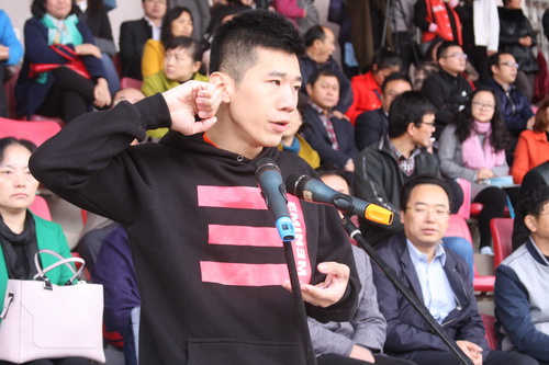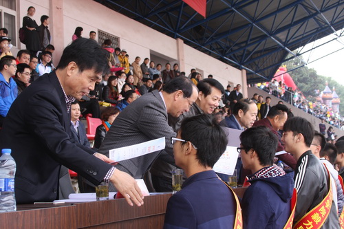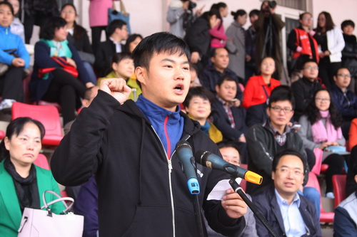 校领导为获得毅力男生和毅力女生的同学代表颁奖,获奖学生代表、土建学院温伟成同学作了发言。