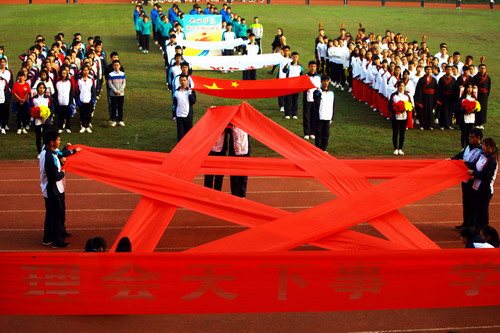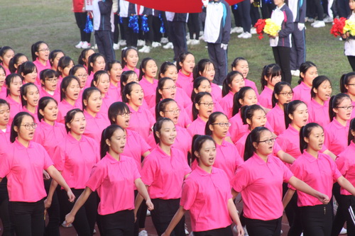 入场式结束后,国旗护卫班的同学们迈着矫健整齐的步伐坚定地走向升旗台,在庄严的国歌声中,在全体站立师生的注目礼下,五星红旗冉冉升起在赛场上,飘扬在