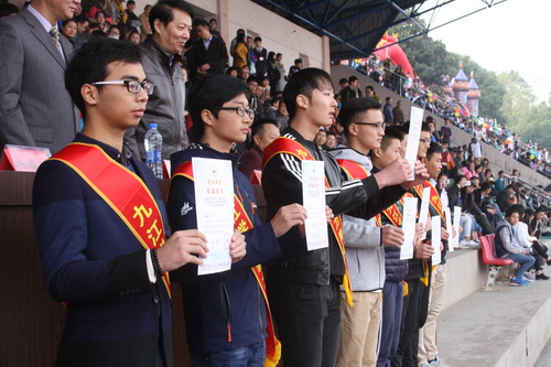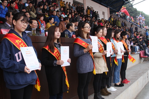 副校长杨焱林宣读了《关于表彰首届毅力男生、毅力女生的决定》,表彰了自2013年9月学校实行早操制度以来,涌现出来的一批克服困难、积极参与、坚持出操、坚强意志、展现良好大学生精神面貌的同学。