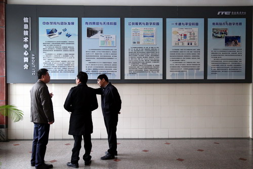 梅龙宝教授对来宾一行表示热烈欢迎,并简要地介绍了信息中心的基本情况,重点介绍了学校有线网络、无线网络、一卡通、数字校园、平安校园和数字媒体等项目的建设和应用情况。