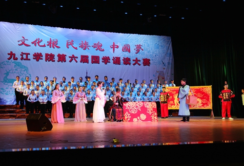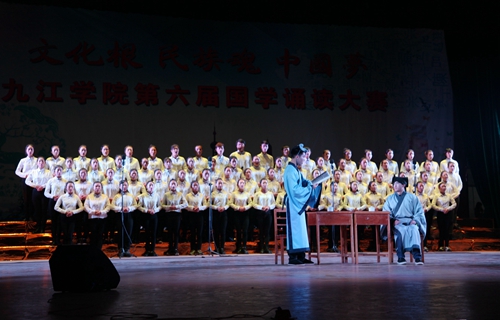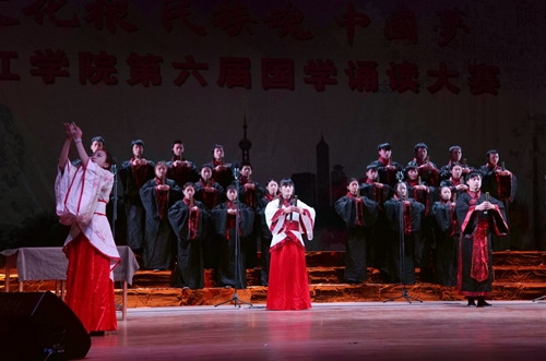 每年我校的国学活动有30多项、100多场次,2万多人次参与其中。一大批国学班、国学社、诗会雅集、宣讲团等等举行了丰富多彩的活动,进一步推动了国学的普及、研究、传播和交流。在众多的国学活动中,每学期一次的国学诵读大赛,成为了全校师生最引人注目的品牌活动。品读经典,因为经典中有大千世界;诵读经典,因为经典中有人间大义;对话经典,让人们拓展视野、启迪心智;传承经典,使人们陶冶品行、成人成才。