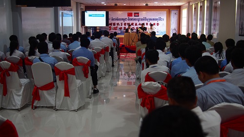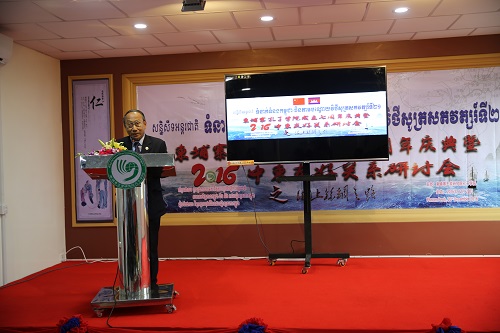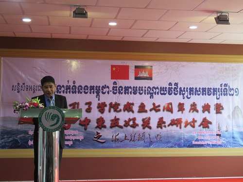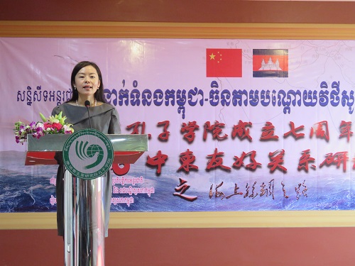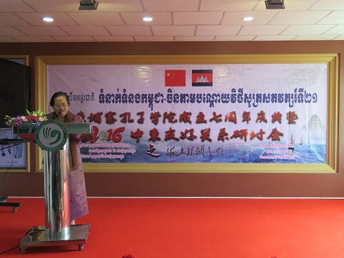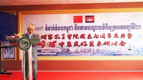 12月20日,柬埔寨王家研究院孔子学院七周年庆典暨 “2016年中柬友好关系研讨会之海上丝绸之路” 在柬埔寨王家研究院孔子学院三楼会议室隆重举行。柬中友好协会会长、柬埔寨宪法理事会原主席艾森沃阁下(Ek Samol)、柬埔寨外交与国际合作部部长特别代表龙伟禄阁下(Long Visalo)、中国驻柬埔寨大使馆二等秘书、副教授韩静女士、柬埔寨王家研究院院长克罗媞达院士(Khlot Thyda)和 国际合作交流处王贤淼副处长出席会议,柬华理事总会、广东商会、江西商会、广东驻柬埔寨经贸代表、中国文化中心、柬埔寨国防部、旅游部、教育部、文化部等部门及相关企业嘉宾一同到场祝贺。孔子学院院长谢莫尼勒(HE Chea Munyrith)、中方院长夏修龙教授及孔子学院教师和学生300余人参加了活动。