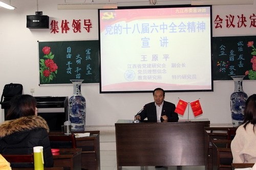 为了进一步学习贯彻党的十八届六中全会精神,围绕“两学一做”学习教育要求,深入学习《关于新形势下党内政治生活的若干准则》和《中国共产党党内监督条例》,12月29日上午,外国语学院在香远楼315党员活动室召开党委中心组(扩大)学习会,会议邀请了江西省党建研究会副会长王原平教授为宣讲嘉宾,副校长夏启国,外国语学院党委委员,全体师生党员,共计80余人参加学习会,会议由院长韩琨主持。