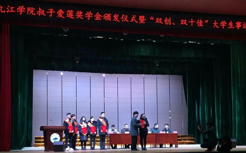 在热烈的掌声中,王副校长为叔子爱莲奖学金获得者颁奖。随后,“十佳大学生”“十佳勤奋学习标兵”“首届创新创业标兵”依次走上讲台,与会领导分别为他们颁奖。