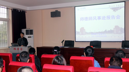 报告结束后,教务处马明亮处长做了总结讲话,他首先对4位做报告的老师表示了崇高的敬意和诚挚的感谢。接着他指出,举办这次报告会,是学校深入贯彻落实教育部《关于进一步加强和改进师德建设意见》的具体举措,也是学校结合“两学一做”开展师德师风建设专项教育活动的升华,目的是大力弘扬优秀教师的先进事迹和崇高精神,激励全体教师弘扬师德风范,自觉加强师德师风修养。最后,马处长对参会教师提出了三点期望:一是作为教师要用先进的思想、高尚的道德、健康的情操、渊博的知识、精湛的教艺陶冶学生,教书育人,做学生成长成才的设计师与引路人。二是要自觉维护学校的声誉,积极为学校的建设与发展献策出力,正确对待功名与利禄,追求学校、团队和个人事业的共同发展。三是要不断开拓创新,锐意进取,努力提高教学水平和科研能力,积极推进教育创新和科技创新,坚韧不拔,执着追求,争创一流的教学科研工作业绩。