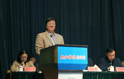 杨焱林副校长致辞,他代表学校党委行政向大会的胜利召开致以热烈的祝贺,向付出辛勤劳动的医院广大干部职工表示亲切的慰问。杨副校长指出,在过去的一年,临床医学院/附属医院按照学校党政领导的工作部署和要求,抢抓机遇,开拓创新,不断寻求新的突破,在医疗技术、教学科研、院区环境、内部管理等方面都迈上了一个新的台阶,医院建设日新月异,事业发展蒸蒸日上,令人欣喜。尤其是学科建设和教学实验实训工作,成绩突出。他表示