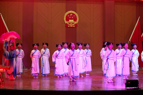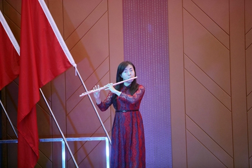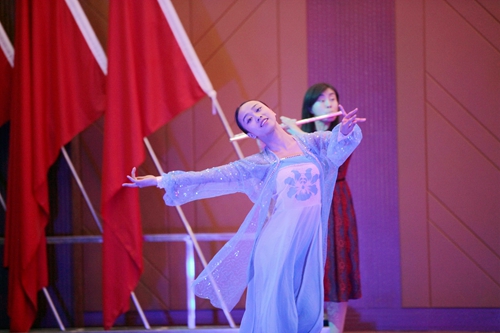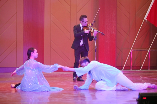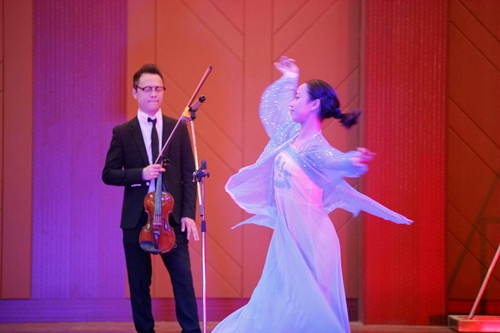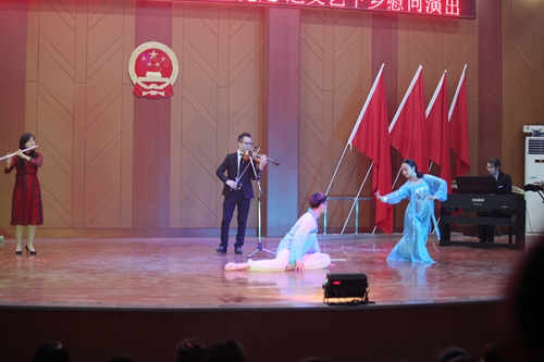 艺术学院王荇荇老师带来的《我爱你中国》,叶树雯、王蕾、理查德·波尔等老师带来的音诗画《梁祝》,郭泗茂老师带来的《中国梦》等节目的精彩表演,掀起了晚会一个又一个高潮。晚会上,官莲小学也为我们带来了国学诵读表演《云水禅心》。