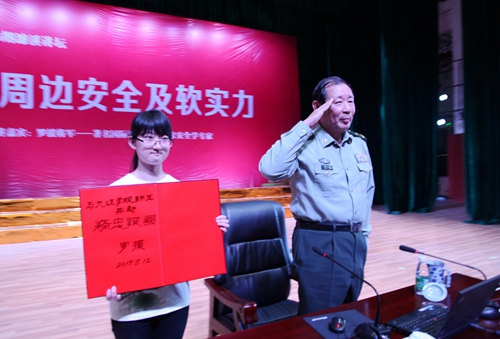 罗援将军的报告不仅是一堂份量厚重的国防教育课,更是一堂饱含深情的爱国主义的教育课,报告强调要大力弘扬民族精神,弘扬爱国主义,要坚决捍卫主权,坚决维护祖国统一,构筑民族精神和爱国主义的钢铁长城。使在场听众进一步认清了当前国防形势和周边动态,增强了国防观念和忧患意识。报告结束后,罗援将军还与现场师生进行了互动,回答了师生提出的问题。罗援将军还为我校濂溪讲坛题词:“与