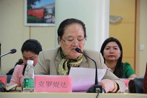柬埔寨王家研究院院长克洛媞达院士做了热情洋溢的致辞。她说,回顾历史可知道中柬友好交往可追溯到两千年以前,在当今两国领导人的共同努力下,双方达成了全面战略合作伙伴关系,促进了两国人民心心相通。接着她对