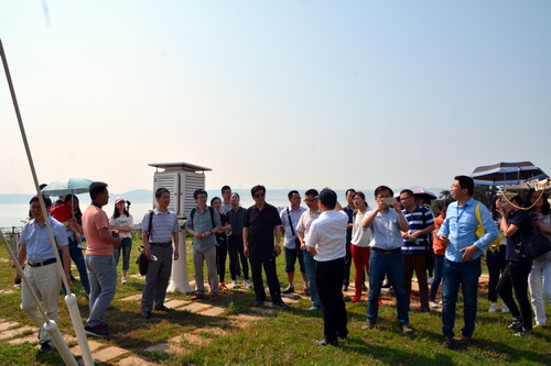 5月21日,研讨会部分专家学者到中国科学院鄱阳湖湖泊湿地观测研究站进行实地考察与交流。参观了观测站的气象观测场、物质输移模拟实验场、湖泊湿地生态恢复研究实验场和湖泊水文自动监测站等试验基地,并与观测站的研究人员进行了学术交流。