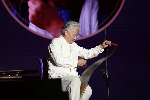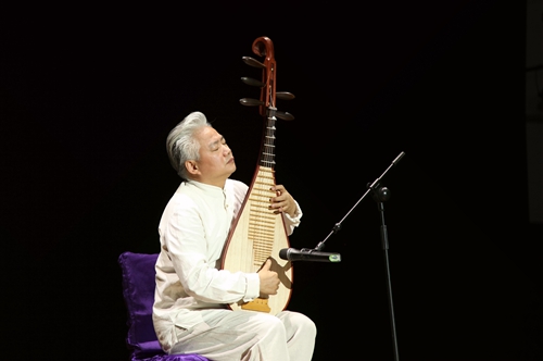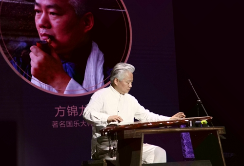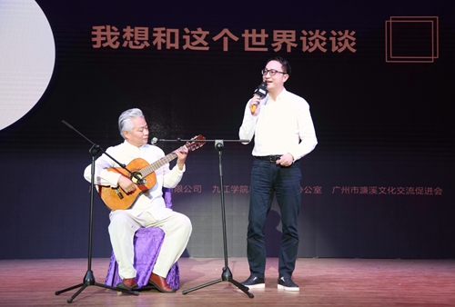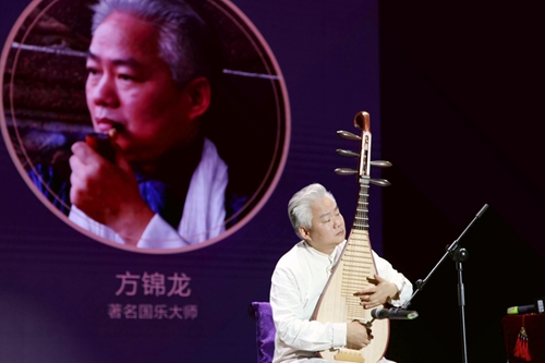 在吴春清和田延友两位嘉宾触动人心的演讲之后,方锦龙先生和田延友又以一段“不靠谱脱口秀”调动了全场氛围,赢得了观众热烈的掌声。随后,方锦龙先生介绍了来自世界各地的部分乐器及其演奏方法,并用一把五弦琵琶模拟演奏了世界不同地区不同弦乐的代表曲子。应大家的要求,他还用锯琴、五弦琵琶完整地演奏了《渔光曲》《琵琶语》等曲子。方锦龙先生在演奏中长于创新,其演奏风格激情充沛、别具韵味。其有声有色的表演和营造的视听效应,辐射到在场观众心灵深处,产生共鸣与强烈震撼。方锦龙先生以身为中国人而骄傲,每每谈及中国文化时,不忘激励青年学子要了解并热爱无比丰富的中国民族音乐文化。