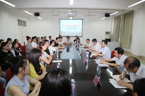 为深入贯彻落实《中共中央、国务院关于加强和改进新形势下高校思想政治工作的意见》和《中共江西省委江西省人民政府关于加强和改进新形势下高校思想政治工作实施意见》的精神,切实围绕立德树人根本任务,推进学校思想政治工作创新发展,增强大学生的“思政课”获得感。时值毕业季,学校决定开展校领导“思想政治工作体验”和“学生生活体验”活动,6月26日下午,校党委书记赵伟来到会计学院立信楼504会议室出席2017届毕业生代表座谈会。党办主任刘遵海、宣传部部长冯健,以及会计学院院长陈小林、党委书记吴铃和该院团委、学生科负责人,辅导员、班主任代表,毕业生代表40余人参加了座谈会。座谈会由会计学院院长陈小林主持。