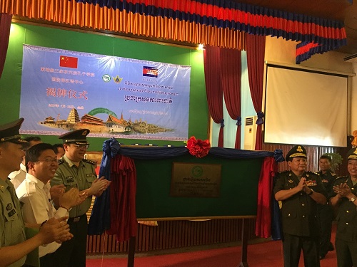 7月12日上午,柬埔寨王家研究院孔子学院柬埔寨国防部汉语中心揭牌仪式在柬埔寨国防部大礼堂隆重举行。柬埔寨国防部副部长晋翁上将(CHEANG Am)、中国驻柬埔寨大使馆武官李宁亚、柬埔寨孔子学院院长谢莫尼勒(H.E.CHEA Munyrith)、中方院长夏修龙及柬埔寨国防部有关官员150余人出席揭牌仪式。