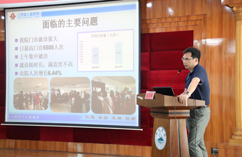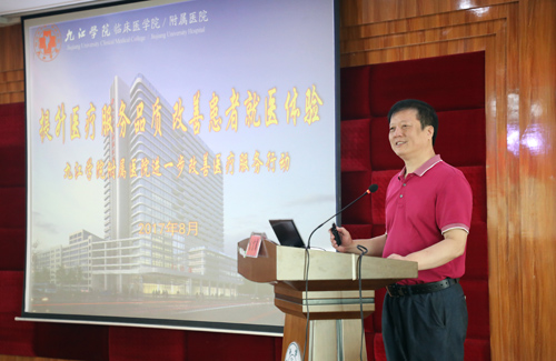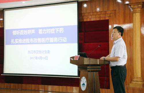 会上,九江市卫计委总经济师徐端以《倾听百姓呼声,着力对症下药,扎实推进我市改善医疗服务行动》为题,对我市改善医疗服务行动的具体举措和成效进行了介绍。临床医学院/附属医院院长张志平在会上作了重点发言,张院长以《提升医疗服务品质,改善患者就医体验》为题,从门诊特色服务、温馨休闲服务、天使之星服务、品质医疗服务及其他特色服务几方面详细介绍了临床医学院/附属医院改善医疗服务行动各项举措及成效,受到与会人员的一致好评。南昌大学第一附属医院医务处处长李建林、省儿童医院副院长陶强分别就改善医疗服务行动的主题进行交流发言。