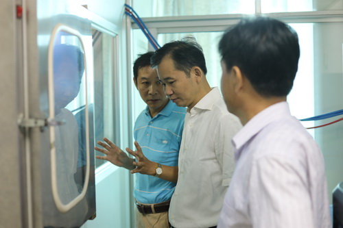 座谈会开始前,赵伟书记和杨耀防副校长参观了实验室的环境和设备,听取了李卫东教授代表团队汇报的《恶性肿瘤细胞双重靶向两亲性载药系统的构建与应用基础研究》项目介绍和省系统生物医学重点实验室的基本情况。