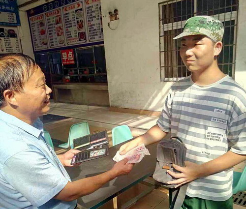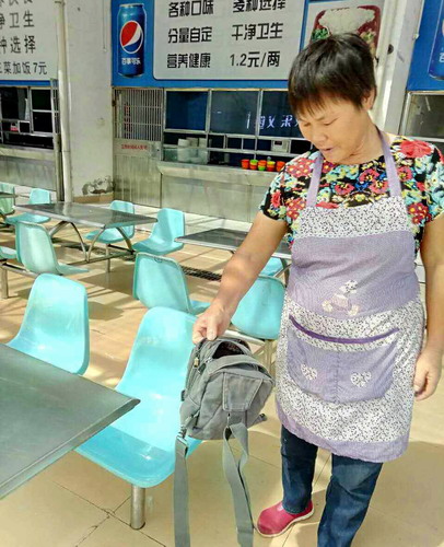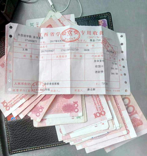 9月14日14:00,主校区学生五食堂员工罗水香阿姨像往常一样在清理餐桌椅,在座位上突然发现一个小挎包。根据后勤管理处员工捡拾客人物品工作流程和规范,罗阿姨当即招呼来旁边的工作人员,在两人共同见证下,用手机拍照录像取证,并逐一清点包内物品后第一时间报告给食堂胡经理。经清点,失主包内有2100余元现金、2张银行卡、1张身份证和缴费单据等其他证件资料,并明确了失主为外国语学院2017级新生王帅。随后,五食堂经理多次电话联系失主王帅同学,由于新生正进行紧张的军训,多次电话联系均无人接听。食堂经理最后通过外国语学院团委负责人在军训场地找到学生本人。王帅同学得到学生会干部通知其财物遗失时,方知背包中的挎包早已遗失,立即跑步来到五食堂交接领回失物。这位来自河南驻马店的个头高高、性格腼腆的大男孩十分感动,当场多次重复“真的太谢谢了,谢谢阿姨”。