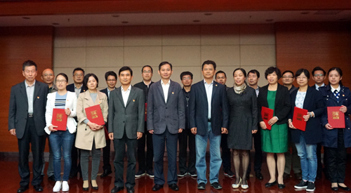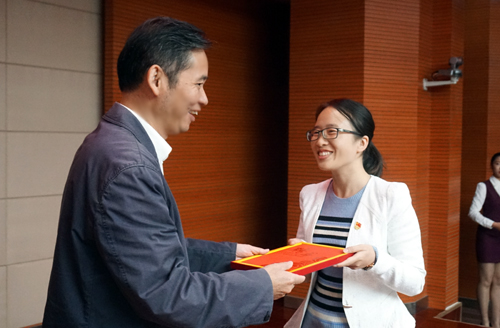在热烈的掌声中,校党委书记赵伟向马克思主义宣讲团授旗,向宣讲团的成员们颁发聘书。宣讲团团长魏立平郑重地接受旗帜,宣讲团成员依次上台接受聘书。