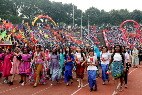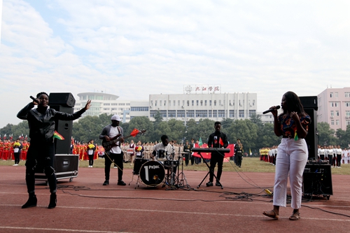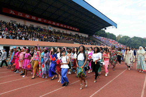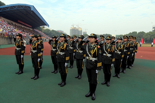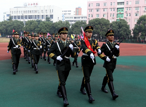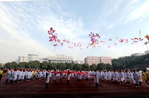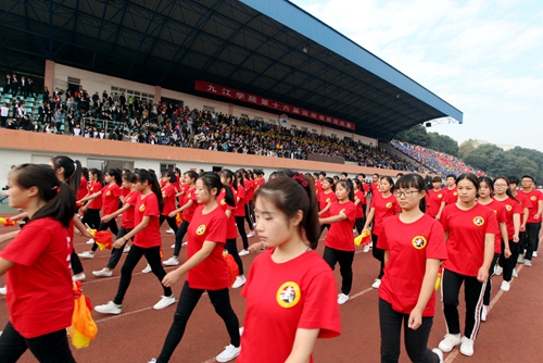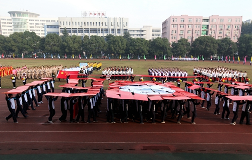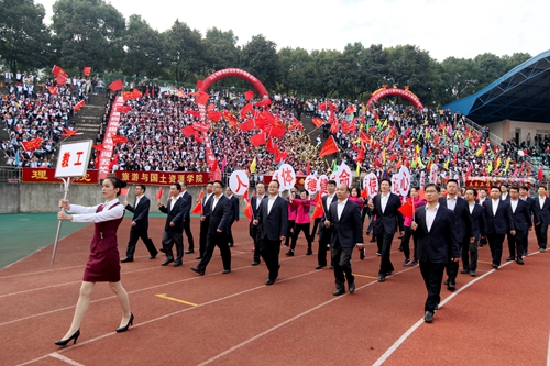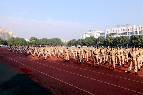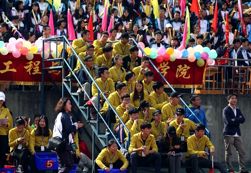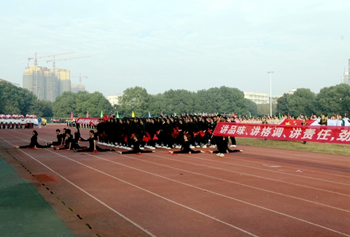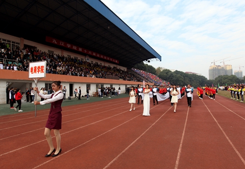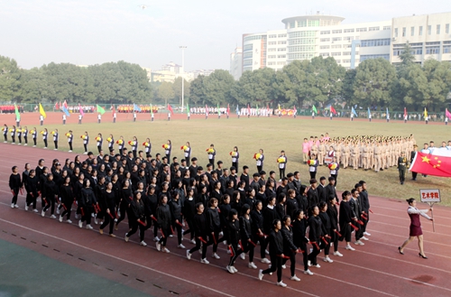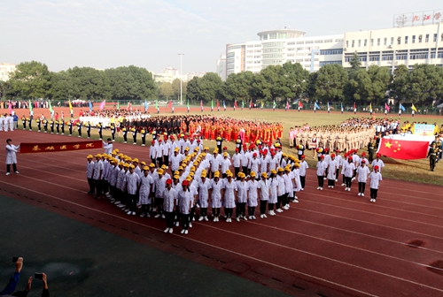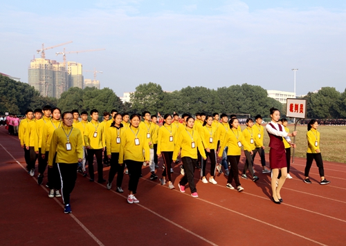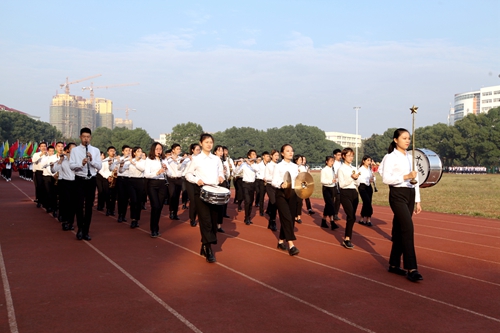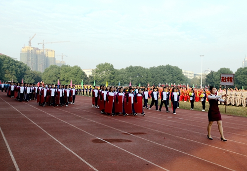 歌声萦绕,看,吸“睛”夺彩的利器上场了,各二级学院方阵队揭开了神秘的面纱。别样的方阵出场勾勒出一道亮丽的风景线,把现场气氛推向了高潮。纵观全场,几乎所有的学院方阵队都在表达同一个主题——学习宣传党的十九大精神。经管学院的迷彩军装、化环学院红色五角星、理学院的脸贴国旗,土建学院更是笔直拉出横幅“新时代、新思想、新征程”……展现着对祖国的热爱。除此之外,机材学院在全校师生面前尽显英雄本色,帅气的着装加上酷比的方程式车惊羡了全场,还有临床医学院萌萌哒的布朗熊和可妮兔更加暖化人心。正如电子学院大一学生何军有所说:“整场开幕式带给我一种视觉的震撼力和新鲜感。”朝气蓬勃的学子踏着整齐的步伐,伴着嘹亮的口号,散发着青春的气息,充分展示了我校学子的朝气与活力。