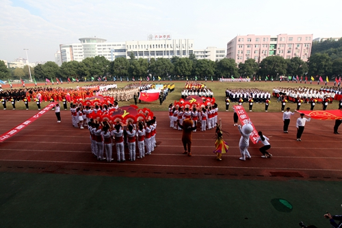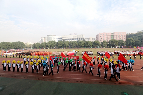 在全国人民深入学习贯彻党的十九大精神热潮中,10月26日上午,主校区南区田径场内红旗飘扬,彩旗招展。 第十六届田径运动会开幕式在南区田径场隆重举行。在家校领导赵伟、刘晓东、魏立平、纪岗昌、王万山、陈春生、夏启国出席,各二级学院党政负责人、各职能部门负责人以及教师、运动员代表、全体2017级学生参加开幕式。第十六届校运会组委会副主任、执行主任、副校长陈春生主持开幕式。